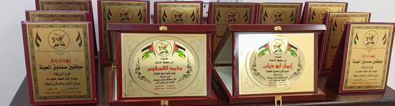 تلقى موظفي مكتب الزرقاء مجموعة من الدروع التكريمية، تقديرًا لجهود موظفي الفرع في خدمة الأسر المنتفعة وتعزيز دور الصندوق في المجتمع المحلي.